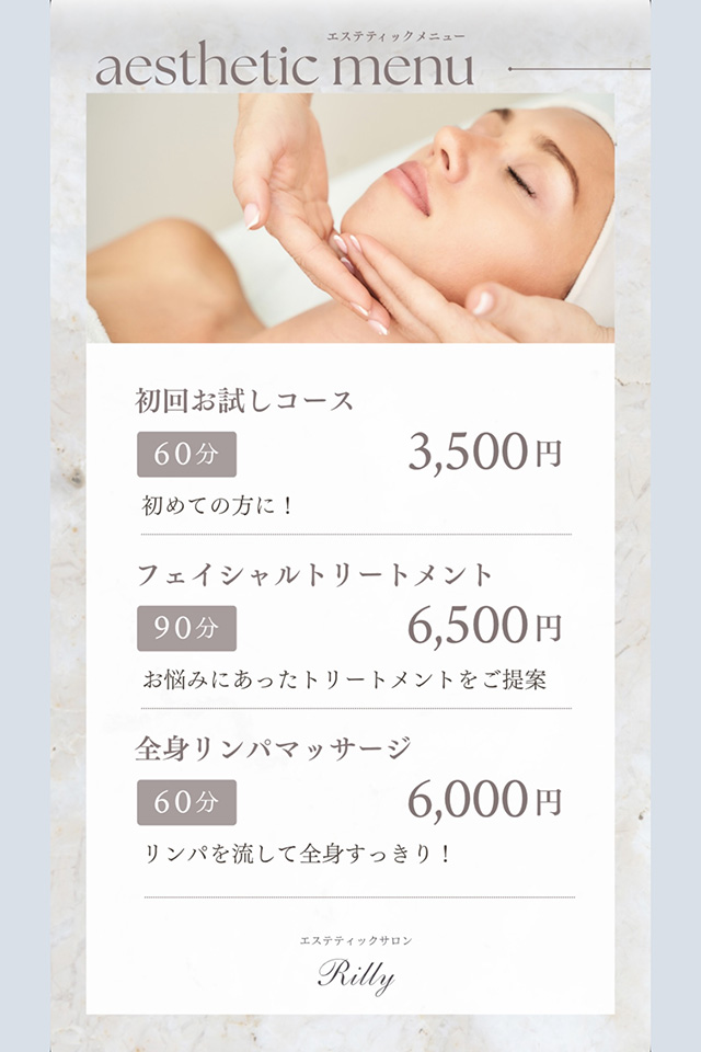 ネイルは「ワンカラー」が4,000円〜。エステは「お試しコース」が3,500円〜と、とてもリーズナブルです。「若い世代にも気軽に通ってほしい」というオーナーの優しさが感じられます。